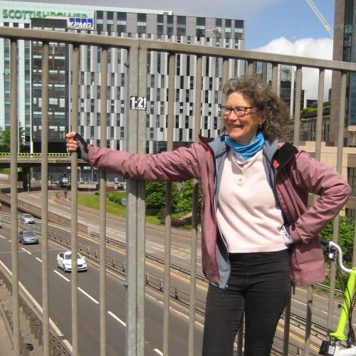 As a child on a white trike customised with a breadbin to fill with rocks, dolls’ heads and other treasures, Mhairi loved cycling adventures. Progressing to an Italian racer, she put it through its paces touring, even though it was geared for flat racing. Several bikes later she is an artist and cycle trainer in Glasgow, teaching people to cycle and leading groups through the city safely.