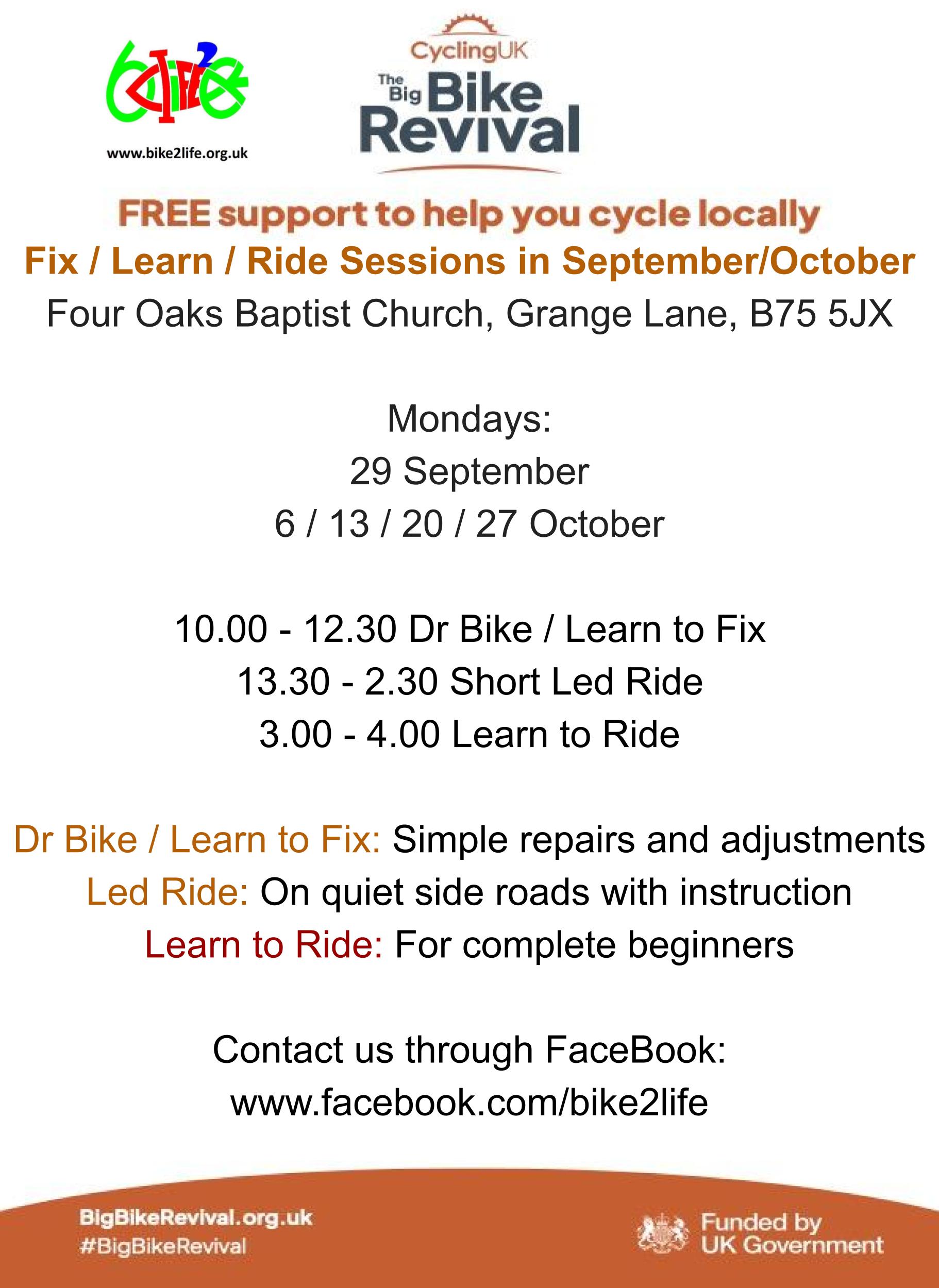 Most months we are at Aldridge Methodist Church offering simple bike fixes and adjustments.