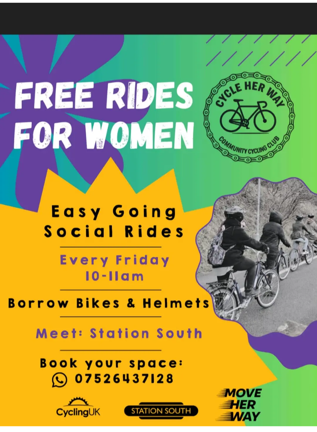 Cycle Her Way ride every week on Fridays at 10am for one hour.
