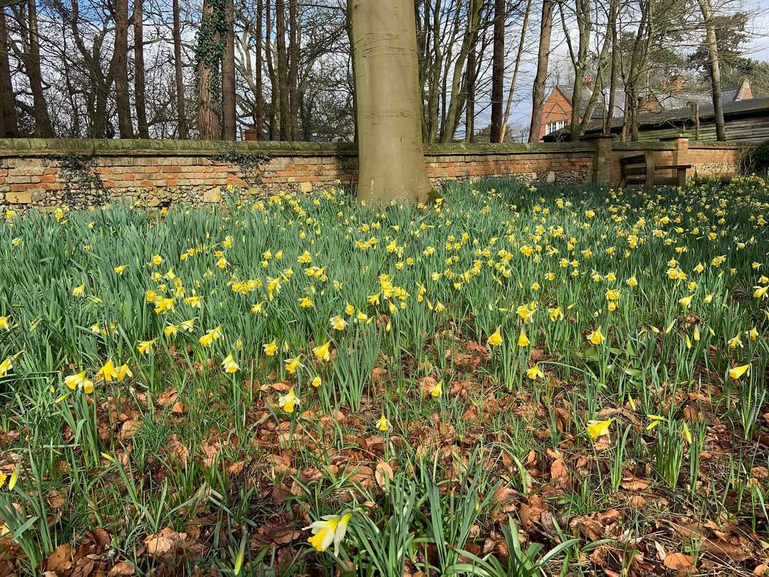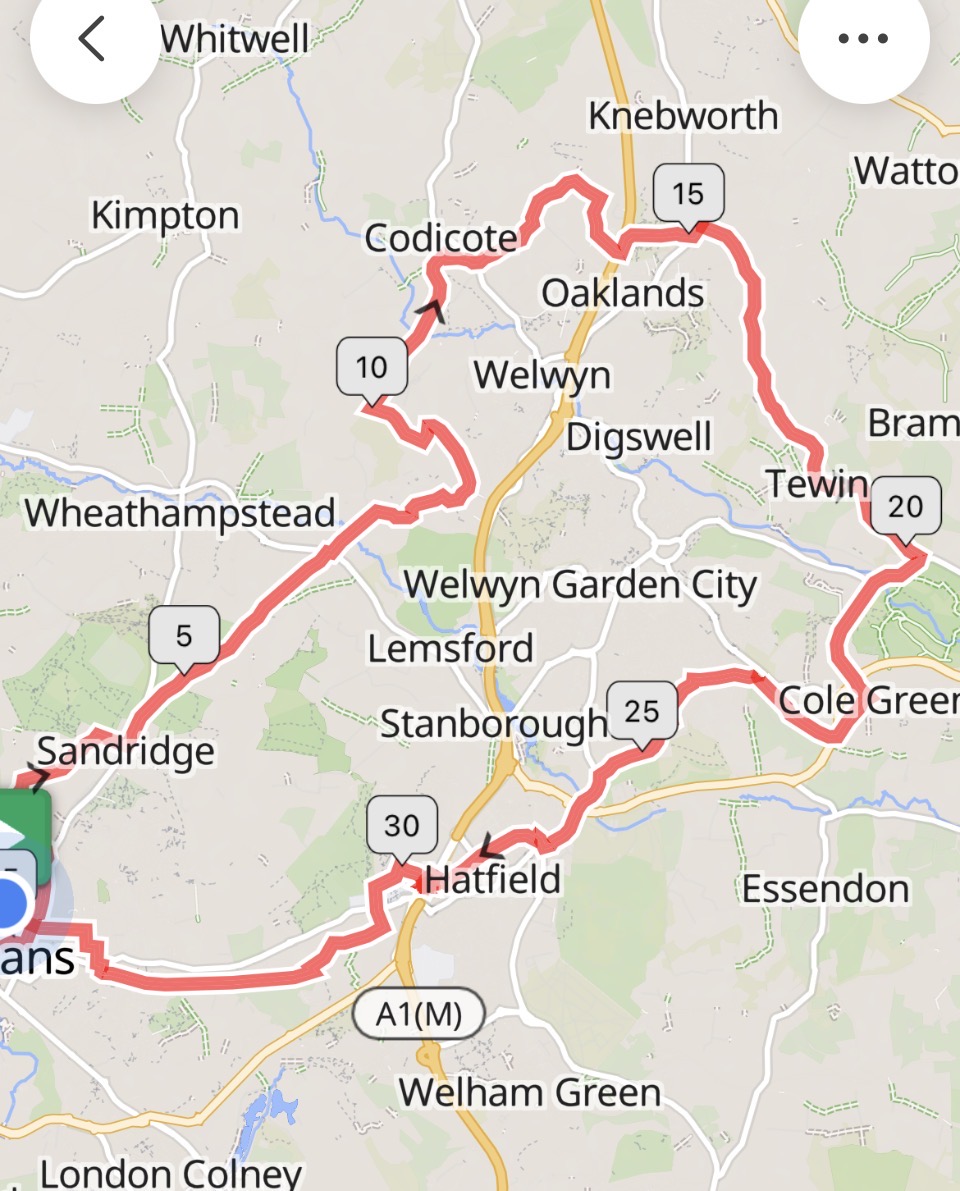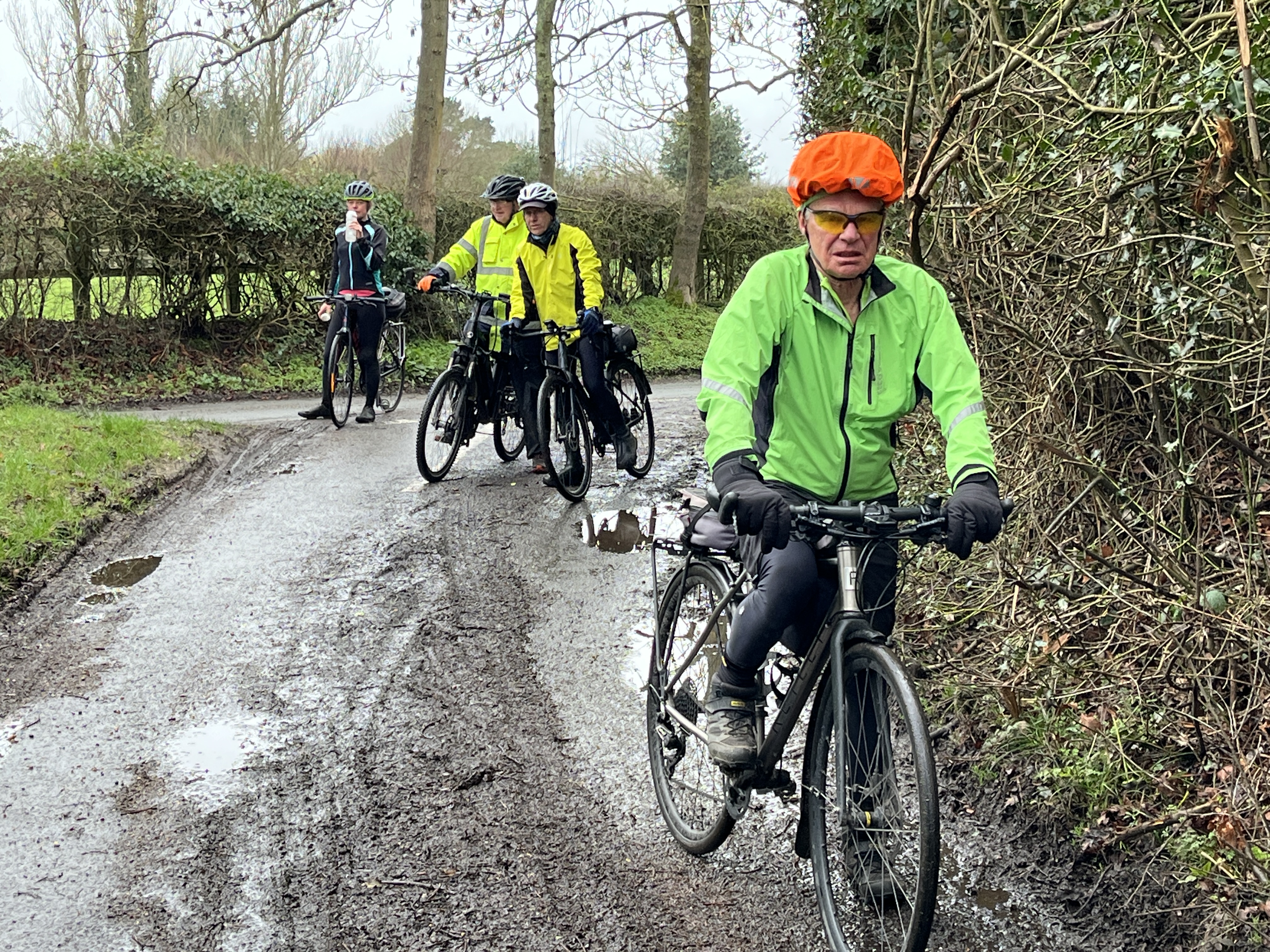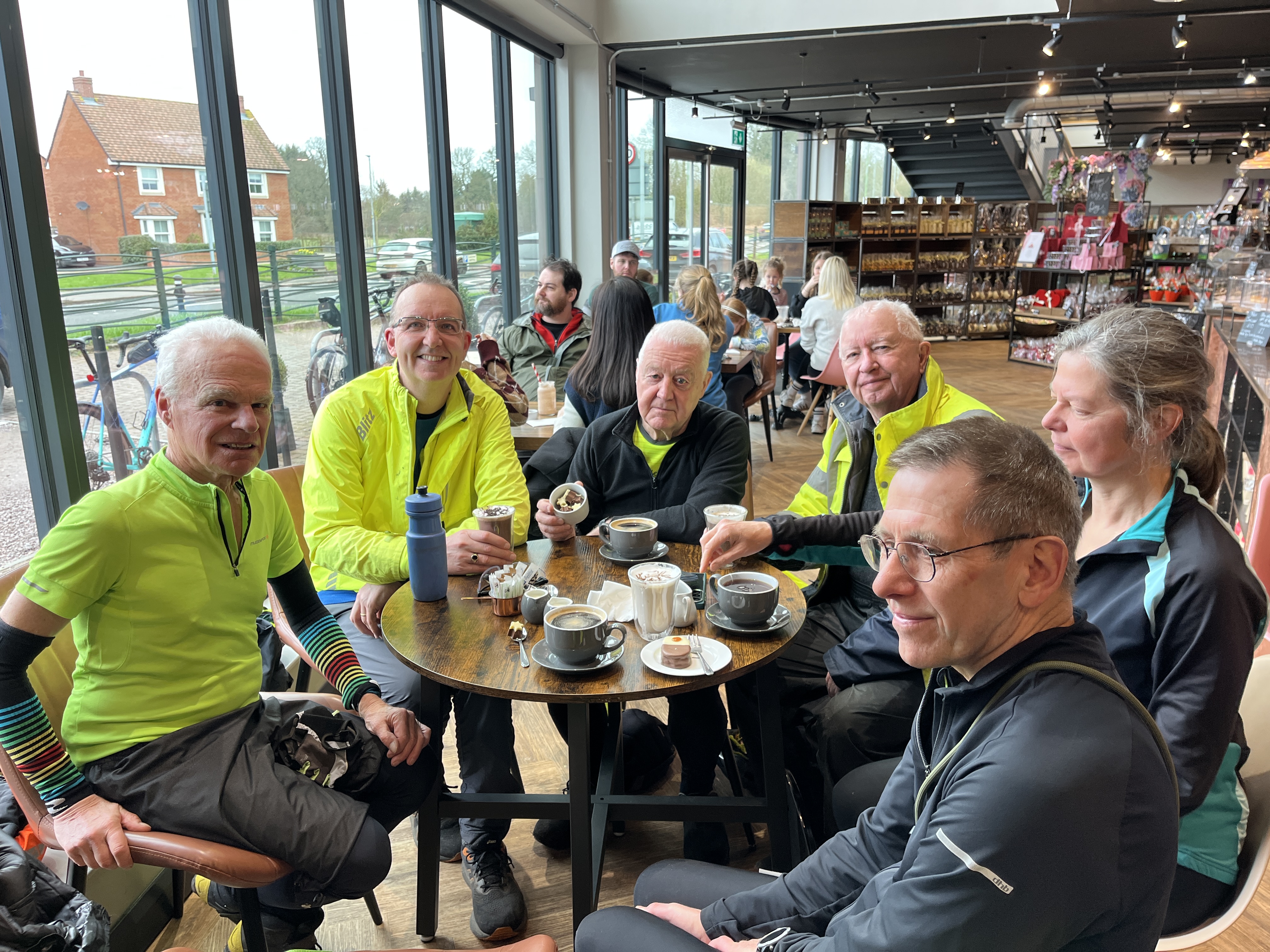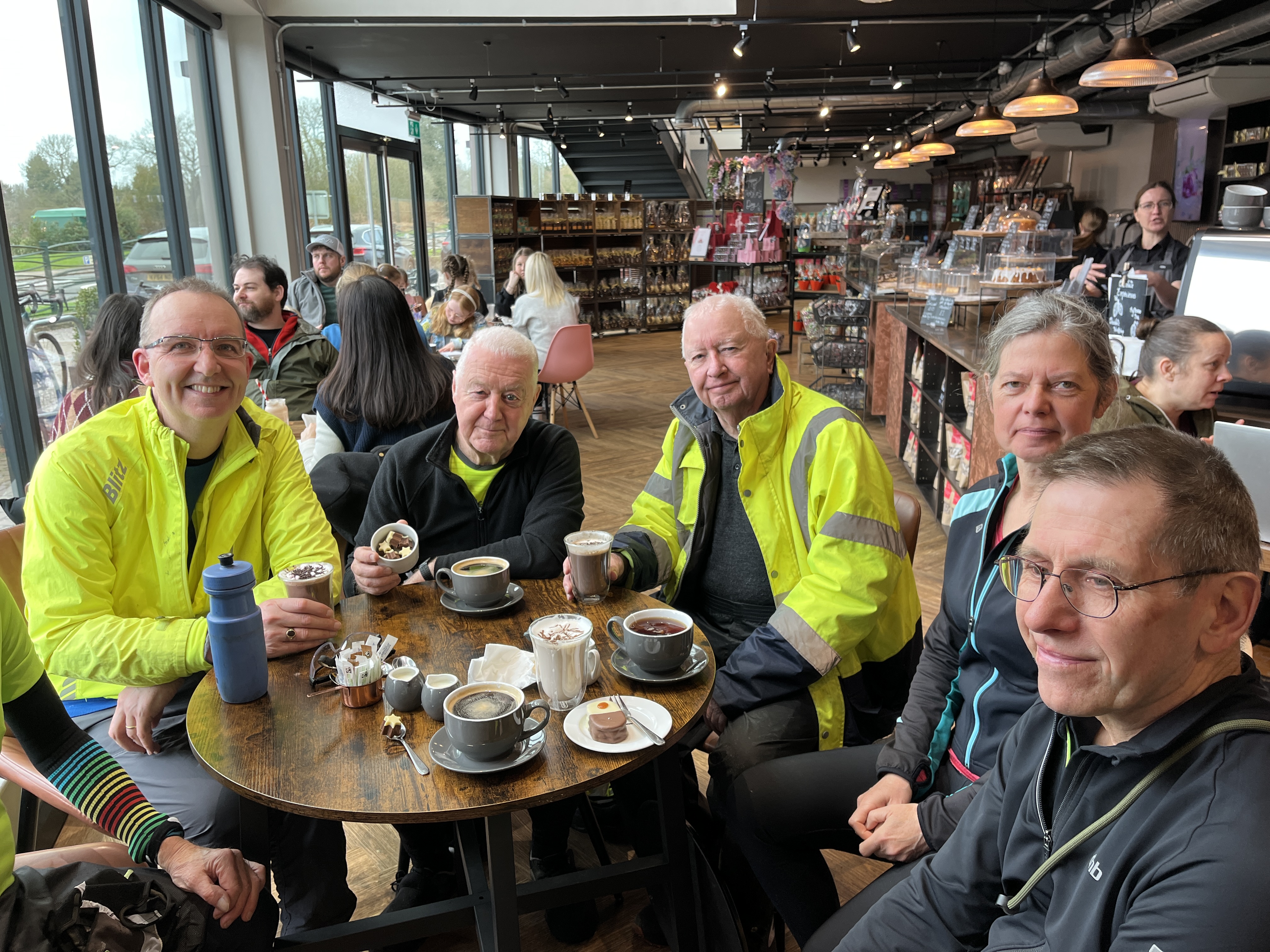 Seven intrepid riders met for the 9.30 departure from the Waterend Barn in St Albans on a day when the weather forecast was less than positive for precipitation. However we set off in cool but not really damp weather to head north via Sandridge and Ayot Green, where we saw a beautiful display of early daffodils in the cemetery. Passing through Rabley Heath we noticed the Robin Hood and Little John pub seemed to have expanded their outdoor and sheltered seating areas so maybe it's worth looking at that pub for a future lunch stop. Down the hill and into Woolmer Green we went for a first visit to The Secret Truffletier cafe at Lessiters chocolate factory. Not much of a secret as it was almost full as we arrived. Happily we managed to bag a table and ordered some drinks. The cakes and chocolates looked delicious and we were pleased that they gave out a "free" chocolate (worth just about £1 each!) with every hot drink ordered. A super place to come to on a cold first day of spring day! As we were a bit late leaving we beelined south via Burnham Green, Tewin and Letty Green before cutting the planned ride short and missing out Essendon and The Candlesticks Hills, by using the Cole Green Way into WGC, then the Alban Way to reach our lunch stop at Harpsfield Hall. Here we found Mike J who had driven there rather than face the inclement weather. A great day out and not nearly as wet as forecast!