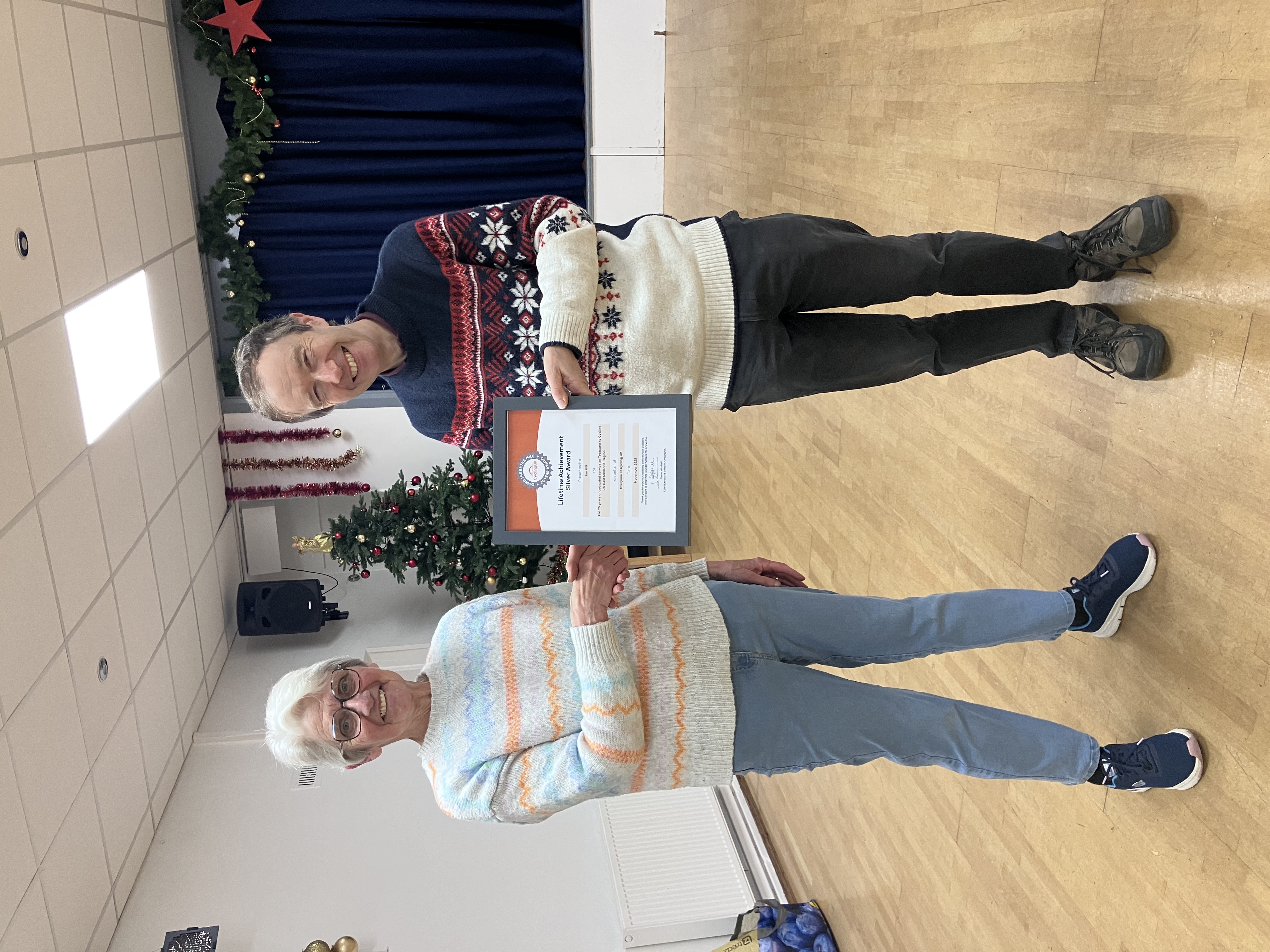 With Ian hill having divulged himself of the Christmas glasses and Elf hat but still wearing his Christmas jumper, we were delighted to award Ian Hill Cycling UK’s ‘Lifetime Achievement Award’ (SILVER) in recognition of his 25 years’ service as Cycling UK East Midlands Region’s Treasurer. A remarkable achievement and a well-deserved award. Thanks to Jean Lakin for the presentation.