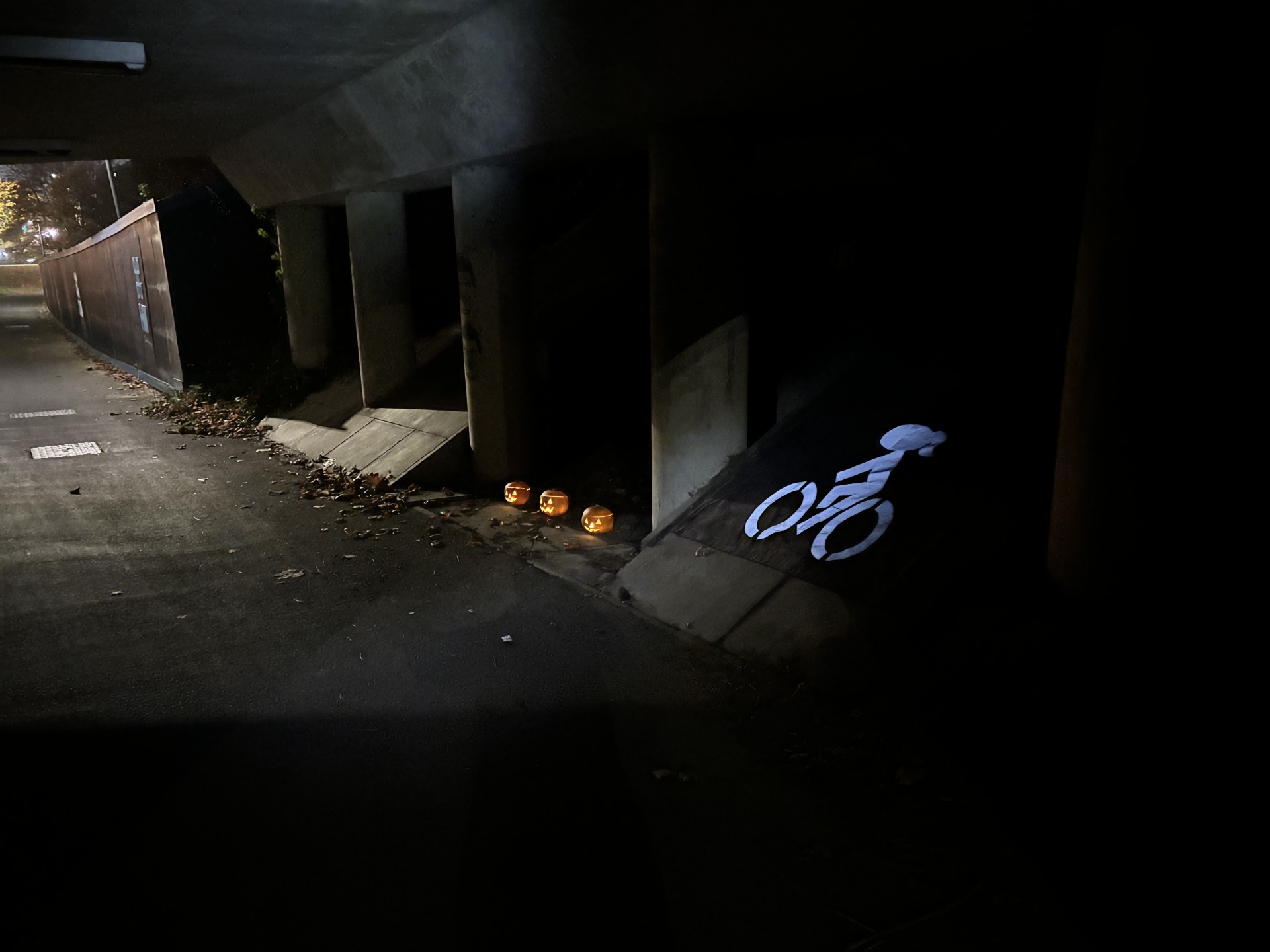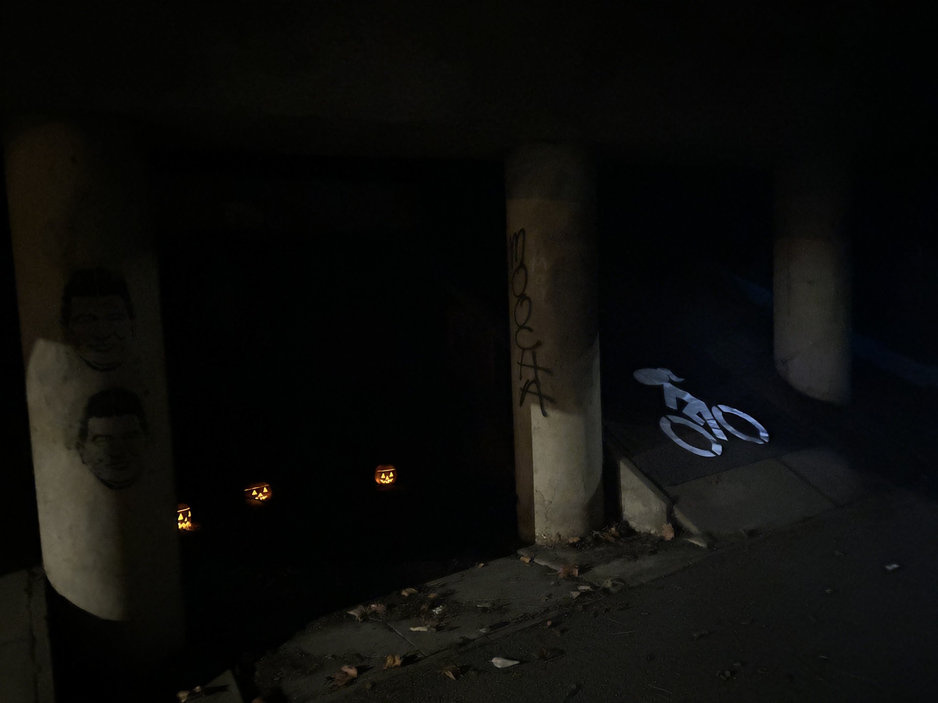 We have now been been campaigning to both Hill and HCC for over 3 years. In October 2024 we put up a Halloween display - a big banner and 3 pumpkins - to point out that “dark underpasses are scary all the time, not just Halloween”.