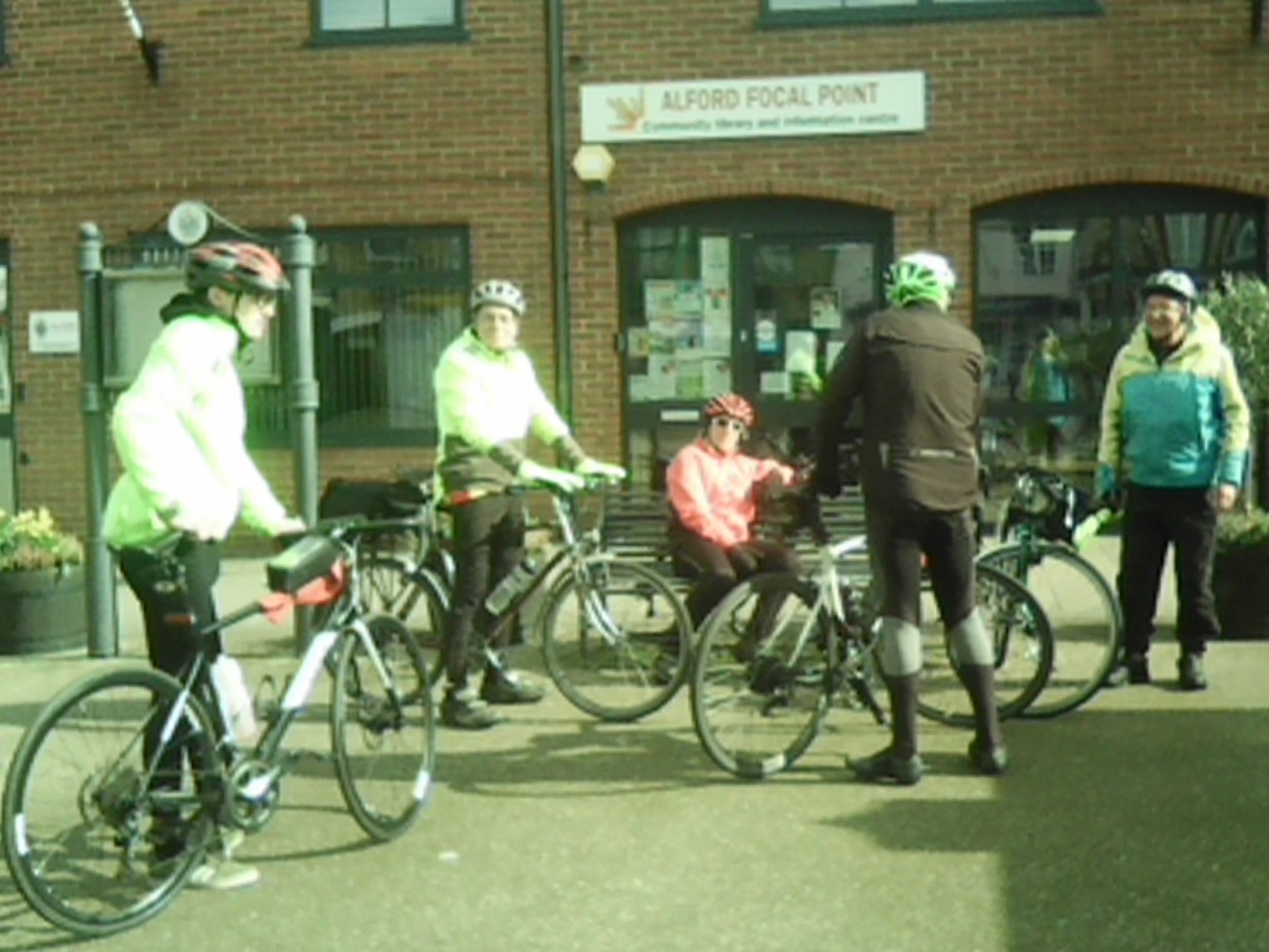 Outbound, our favourite route was followed through Stewton and Legbourne Furze but this time picking up the main road all the way to Withern, where we met up with Alan. Progress into the headwind was tough, especially on the exposed roads to Alford but we were on schedule and Steve was waiting for us outside the library. Time for a breather!